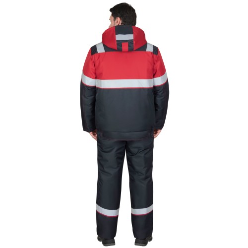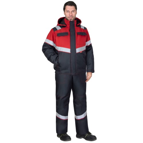 Костюм зимний, утеплённый, состоит из укороченной куртки и полукомбинезона. В костюме предусмотрена лента светоотражающая мелкодисперсная белая ш.50 мм для обеспечения видимости.