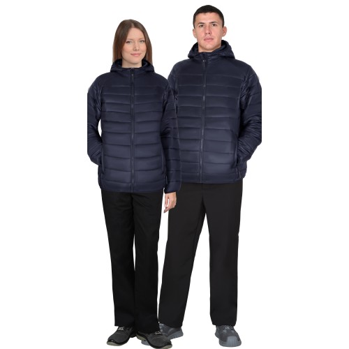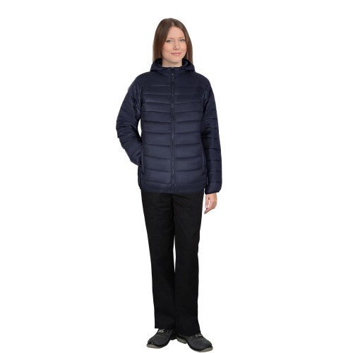 Куртка, утепленная из стёганного полотна, с центральной бортовой застёжкой молния, с втачным капюшоном, с общей кокеткой полочек и спинки, с втачными рукавами, с карманами на молнии в шве рельефа, с удлинённой фигурной линией низа на спинке. Низ куртки, низ рукавов и лицевой вырез капюшона окантованы эластичной тесьмой.