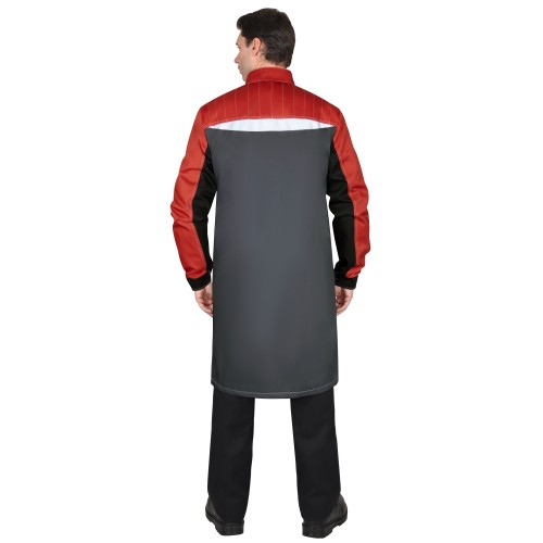 Халат мужской прямого силуэта, с центральной потайной застёжкой на пуговицы, с воротником стойка, с втачными рукавами с манжетой на пуговице, с нагрудными и нижними карманами, с разрезами в боковых швах, спереди и сзади элементы из ленты светоотражающей 50 мм для обеспечения сигнальной видимости. В халате предусмотрено крепление бейджа.