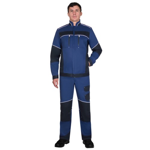 Куртка со световозвращающим кантом, прямого силуэта, с центральной застёжкой молния под узкой ветрозащитной планкой, втачным воротником стойка с закруглёнными концами, нагрудными накладными карманами с вертикальной молнией и клапанами на всю ширину полочки, нижними карманами в рельефных швах с молнией. Рукава втачные, с отрезной манжетой на кнопках. Линия низа спинки овальной формы, удлинена относительно полочек. По низу полочек отрезной пояс, по низу спинки обтачка.