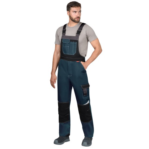 Полукомбинезон прямой с застёжкой спереди - гульфик с молнией и с застёжкой в правом боковом шве на пуговицы, с отрезной грудкой, с бретелями, с боковыми внутренними карманами на передних половинках, с накладными карманами на правой задней половинке и на левом боковом шве. Полукомбинезон с объемными наколенниками с нижним входом для амортизационного вкладыша. Бретели регулируются при помощи застежек-фастексов и резинки. В полукомбинезоне предусмотрены светоотражающие элементы, для обозначения сигнальной видимости.