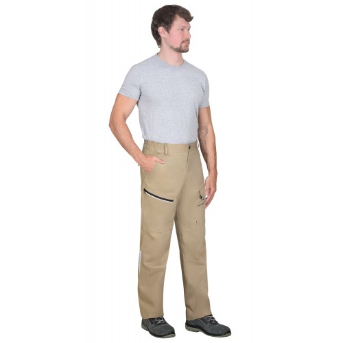 Брюки прямого кроя, с декоративными с застёжкой в среднем шве передних половинок гульфика на молнию, отрезным поясом, частично стянутым по бокам эластичной лентой и застёжкой на пуговицу, многофункциональными карманами. Объём по низу брюк регулируется шнуром с фиксатором.